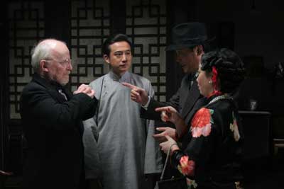 昨天拍攝的是冠曉荷夫婦聽說瑞宣要進(jìn)英國(guó)府做事,趕緊來祁家拍馬屁,在祁家正好遇上英國(guó)府的富善來做客,冠曉荷夫婦就一并討好猛拉關(guān)系。在這場(chǎng)戲里,《四世同堂》的幾個(gè)最受關(guān)注的主要人物集體出場(chǎng):元秋扮演的大赤包,趙寶剛扮演的冠曉荷,黃磊扮演的瑞宣,蔣勤勤扮演的韻梅……因此劇組格外重視。因?yàn)樵锸窍愀垩輪T,扮演富善的是一位英國(guó)人,趙寶剛是地道的北京人,在現(xiàn)場(chǎng)三種“口音”大對(duì)戲,非常幽默搞笑,一旁的工作人員都樂個(gè)不停。
