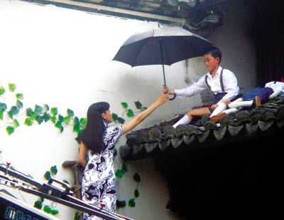 昨日的一場戲,是秦嵐和劇中的兒子吳磊拍對手戲。由于天氣炎熱,秦嵐說雖有洋傘遮陽,但妝還是化得很快。小演員吳磊當天很是不適,拍到最后竟然中暑,又吐又哭,忙壞了劇組的工作人員。按照劇情,秦嵐要從屋頂上往下跳,盡管劇組為她請了替身,但為了追求真實和進度,秦嵐親自上陣,從數(shù)米高的地方往下跳,這場戲總算結(jié)束。