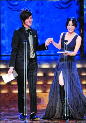 當(dāng)天,獲獎(jiǎng)的韓劇只有獲得“最優(yōu)秀青少年電視劇獎(jiǎng)”的《jungle_fish》與獲得“優(yōu)秀短篇獎(jiǎng)”的《黃金新娘》,雖然有韓星柳真和崔秀鐘擔(dān)任司儀,東方神起任表演嘉賓,還有獲得“最受歡迎男、女演員”的李準(zhǔn)基和南相美出席,但是中國(guó)明星的魅力絕對(duì)難以抵擋。蔡琳當(dāng)天以低V長(zhǎng)裙配高筒靴的造型出現(xiàn),和小綜一起頒發(fā)“最佳男、女演員獎(jiǎng)”,小綜對(duì)蔡琳贊不絕口,還頻頻表示自己被電暈了,哄得蔡琳十分開心。而且小綜還不時(shí)用半咸淡韓語和臺(tái)下粉絲打招呼,引得粉絲們陣陣歡呼,大喊偶像的名字。