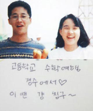 照片中的車(chē)太賢與崔錫恩每人手拿三個(gè)熱狗露出燦爛笑容,照片的背面寫(xiě)著:“高中旅行在慶州♡。這時(shí)還只是朋友~!