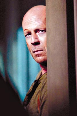今日,《虎膽龍威4.0》與廣州觀眾見面。這部影片不僅要面臨《色,戒》的余威,還要與另一部好萊塢大片《諜影重重3》打擂臺,但是發(fā)行方仍然看好影片的票房,因?yàn)樵撈那叭逊e累了大量的鐵桿粉絲,因?yàn)樵撈闹餮菔谴竺ΧΦ牟剪斔?#183;威利斯。今年52歲的布魯斯·威利斯尚能打否?看過影片的記者贊揚(yáng):寶刀未老,十分火爆。布魯斯·威利斯則自夸:“我還是25歲的小青年!”