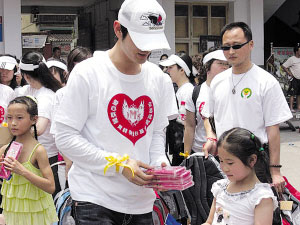 5月16日,在“5·12地震”發(fā)生的第四天,黃曉明帶著醫(yī)療和救援志愿隊(duì)趕到受災(zāi)最嚴(yán)重的遵道鎮(zhèn)、漢旺鎮(zhèn)和死傷人數(shù)最為慘重的東方汽輪廠等地,以一名普通志愿者的身份默默幫忙。昨天,在兒童節(jié)這一天,黃曉明又親自率領(lǐng)自己的愛心基金會(huì)成員們,二度進(jìn)入重災(zāi)區(qū)綿陽安縣的數(shù)所小學(xué),給孩子們帶去急缺的生活學(xué)習(xí)用品。本報(bào)記者昨天也全程陪同,見證了這位將慈善視之“習(xí)慣”的明星的真性情一面。