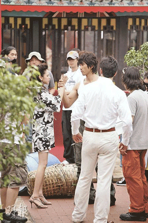 據(jù)香港《明報(bào)》報(bào)道,由于韓劇《伊甸之東》劇組要保持劇集內(nèi)容的神秘,故記者采訪時(shí)要保持遠(yuǎn)距離。不過現(xiàn)場得見,宋承憲的“掃地”裝扮也有型過人,白色背心與軍褲,展示健碩身形。而跟他有對(duì)手戲的Zoie也被其電眼電暈,不敢與他對(duì)望。
