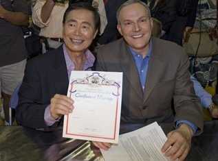 中新網6月18日電 加州在16日成為美國第二個允許同性戀結婚的州,17日加州各地就有數(shù)百對同性戀進行結婚登記,其中還包括曾經演出《星際迷航》的日裔美國演員竹井喬治(George Takei),不過也有一些保守人士進行抗議,批評同性戀婚姻是種變態(tài)婚姻。