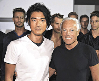 名服裝設(shè)計(jì)師阿瑪尼邀金城武(左)到米蘭欣賞新裝發(fā)表會(huì)。