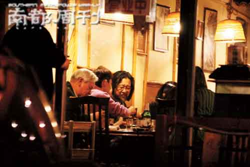 4月5日,話劇《暗戀桃花源》在保利劇院的最后一場演出結(jié)束后,導(dǎo)演賴聲川、主演黃磊孫莉夫婦和何炅、喻恩泰等一行人來到了簋街附近的一家火鍋店消夜,席間氣氛非常熱烈。記者看到在當(dāng)天的飯席上除了孫莉和另一位女演員外,還有一位氣質(zhì)不俗、妝容精致的中年女性坐在賴聲川的身旁,酒席上的明星大腕們對這位女性看上去非常尊重,每當(dāng)她講話時,眾人都認(rèn)真傾聽,不住點頭,顯示出她在“桃花源”劇組中的分量不輕。后來記者得知當(dāng)天那位儀表端莊文雅的女性正是賴聲川甘居幕后的妻子丁乃竺。怪不得當(dāng)天晚上,黃磊等大腕們對那位女性恭敬有加,原來是“老板娘”親自來慰問勞軍了。也許因為太高興,兩次出門接打電話的何炅手舞足蹈,肩斜腰軟,舉止活像搞怪的小姑娘。再加上他穿著粉紅色連帽衫,背著黑色時髦大包,還真容易誤認(rèn)為是女孩兒。