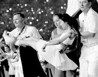 值得一提的是,當(dāng)晚,有位白衣姑娘因透支體力而昏厥。在網(wǎng)上,一張照片記錄了這一幕:一位白衣MM不省人事,左手因抽筋痙攣而僵硬。讓人感動的是,這位姑娘暈倒在地后,第一時間抱起她的,是一位美麗的外國女運(yùn)動員,兩旁還有兩位身穿白衣的外籍工作人員,一人托住她的腳,一人扶住她的頭,面露焦急,奔跑著,將姑娘送下場。這一幕,感動了無數(shù)網(wǎng)友,紛紛感謝這3位外國友人的熱心,并急切地搜索著他們的資料!罢嬲\的國際友誼!為這樣的和諧、友好鼓掌!”有網(wǎng)友在網(wǎng)上發(fā)了無數(shù)個“謝謝”來表達(dá)無法表達(dá)的謝意。