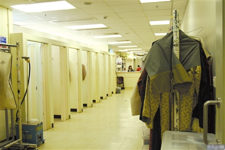 化妝室的盡頭連接著服裝間。走進(jìn)服裝間,記者發(fā)現(xiàn)里面還有一排更衣室。更衣室盡頭有一個柜臺,兩旁放著掛滿衣服的推車。平時衣服的推送靠的就是這些不起眼的推車。服裝間外堆放著數(shù)個箱子,里面放著“時裝戒指”、“鉆石戒指”和“心口針”等人造首飾。據(jù)了解,TVB的演員,無論多大牌的明星,都是公用化妝間,只有兩個人有自己的化妝間,一個是汪明荃,一個是已經(jīng)永別的沈殿霞(肥肥)。
