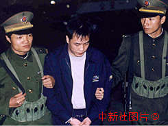 廣東省佛山市公安局經(jīng)過一年的偵查,搗毀了一個粵澳黑社會組織相互勾結(jié)開賭放數(shù)、追債勒索的犯罪團(tuán)伙,抓獲涉案人員二十八名,繳獲槍支彈藥一批。圖為犯罪團(tuán)伙頭目曾啟強(qiáng)(中)被警方抓獲。