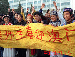 北京中央民族大學(xué)的師生們十日上午在校園內(nèi)用各民族文字書寫喜迎澳門回歸橫幅,迎接這一大喜日子的到來。