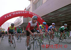 中旅杯99'迎回歸北京-澳門(mén)自行車(chē)?yán)愂迦赵诎拈T(mén)展開(kāi)決逐,騎手們奮勇?tīng)?zhēng)先,志在奪標(biāo)。 中新社傳真 毛建軍攝