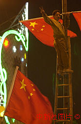 澳門市政工人深夜在葡京酒店賭場(chǎng)外高掛五星紅旗。