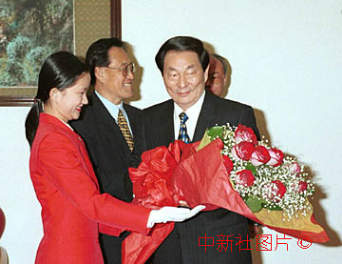 朱镕基總理十九日抵達(dá)澳門新竹苑賓館,禮儀小姐立即獻(xiàn)上一束鮮花。
