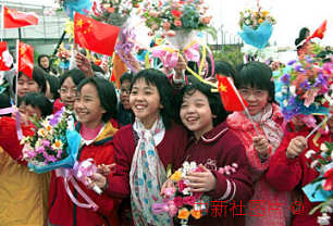 澳門兒童揮舞五星紅旗和花束,熱烈歡迎江澤民主席和朱镕基總理飛抵澳門出席政權(quán)交接儀式。中新社傳真 李剛攝