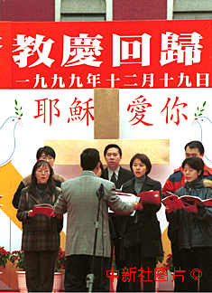 澳門宗教界人士十九日在大三巴遺址廣場齊唱頌歌,歡慶回歸。中新社傳真 賈國榮攝