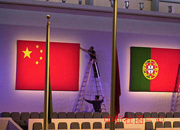 交接儀式即將來(lái)臨,工作人員一絲不茍的在整理國(guó)旗。中新社數(shù)碼傳真 毛建軍攝