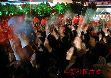 19日晚,珠海市舉辦多臺文藝晚會迎接澳門回歸,圖為九洲城市民在歡呼20日零時的到來。作者:蕭琨
