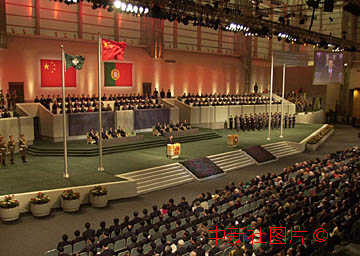 在澳門政權(quán)交接儀式上,中華人民共和國國旗和澳門區(qū)旗高高飄揚。江澤民主席發(fā)表重要講話。中新社數(shù)碼傳真 毛建軍攝