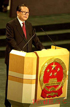 在中葡澳門政權(quán)交接儀式上,中國(guó)國(guó)家主席江澤民發(fā)表重要講話。中新社數(shù)碼傳真 毛建軍攝