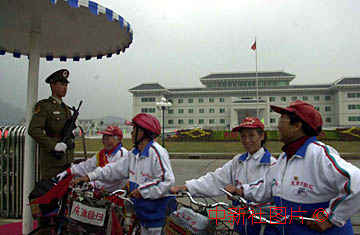 由天津老年人組成的夕陽(yáng)紅自行車隊(duì)赴澳門宣傳團(tuán),18日到達(dá)解放軍駐澳部隊(duì)軍營(yíng)為戰(zhàn)士送行。中新社數(shù)碼傳真 王瑤攝