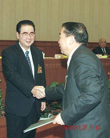 李鵬委員長(zhǎng)二十日下午向全國(guó)人民代表大會(huì)常務(wù)委員會(huì)澳門特別行政區(qū)基本法委員會(huì)組成人員喬曉陽(yáng)等十人頒發(fā)任命書。圖為喬曉陽(yáng)主任接受任命書。作者:任海霞