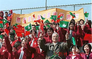 澳門各界人士二十日中午紛紛涌向街頭,高舉橫幅歡迎中國人民解放軍駐澳部隊。中新社傳真 李剛攝