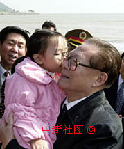 國家主席江澤民21日上午在澳門黑沙灘與澳門小姑娘在一起。中新社/澳新局傳真